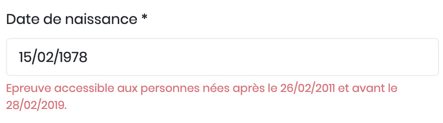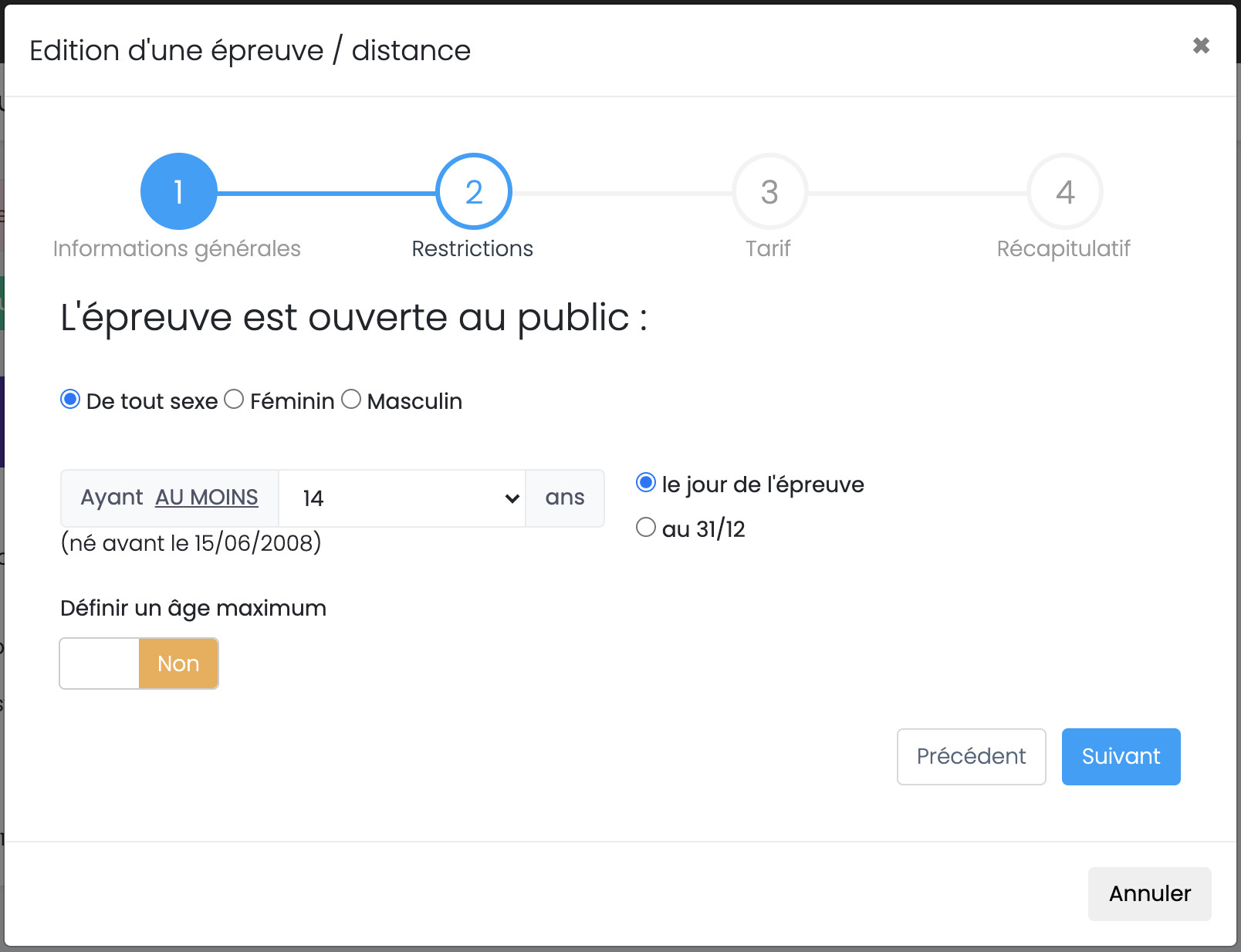 Cette étape vous permet de définir un âge minimum pour pouvoir s'inscrire, et si besoin un âge maximum, pour les courses enfants par exemple.