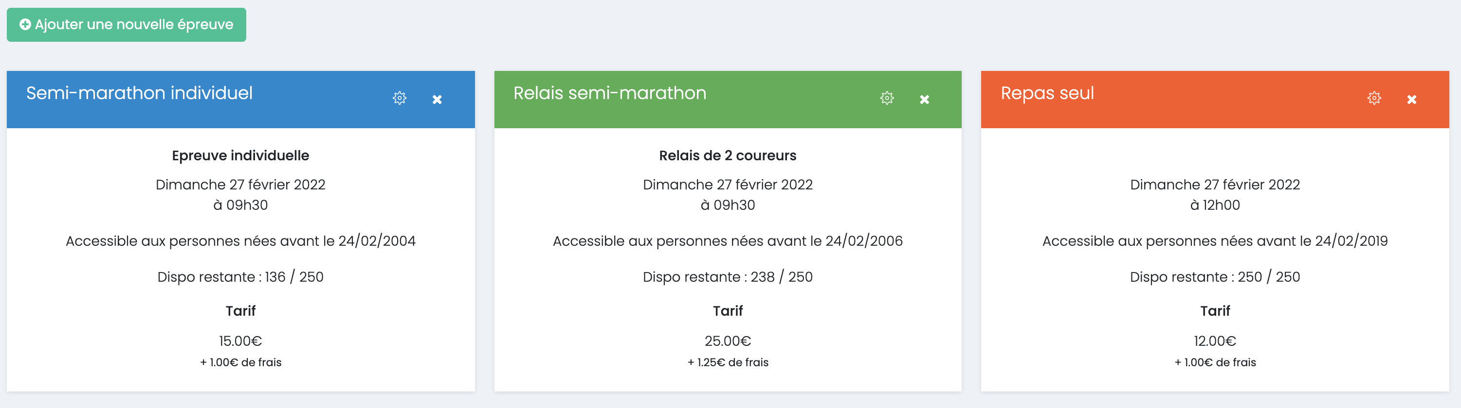 La réponse peut paraître triviale, mais les différentes interprétations que pourrait avoir le mot "épreuve", ainsi que les différentes possibilités offertes par 1dossard, mérite qu'on s'y attarde un peu. Cette pause vous permettra également de réfléchir à la manière la plus claire possible de présenter vos différents formulaires d'inscription à vos futurs participants.