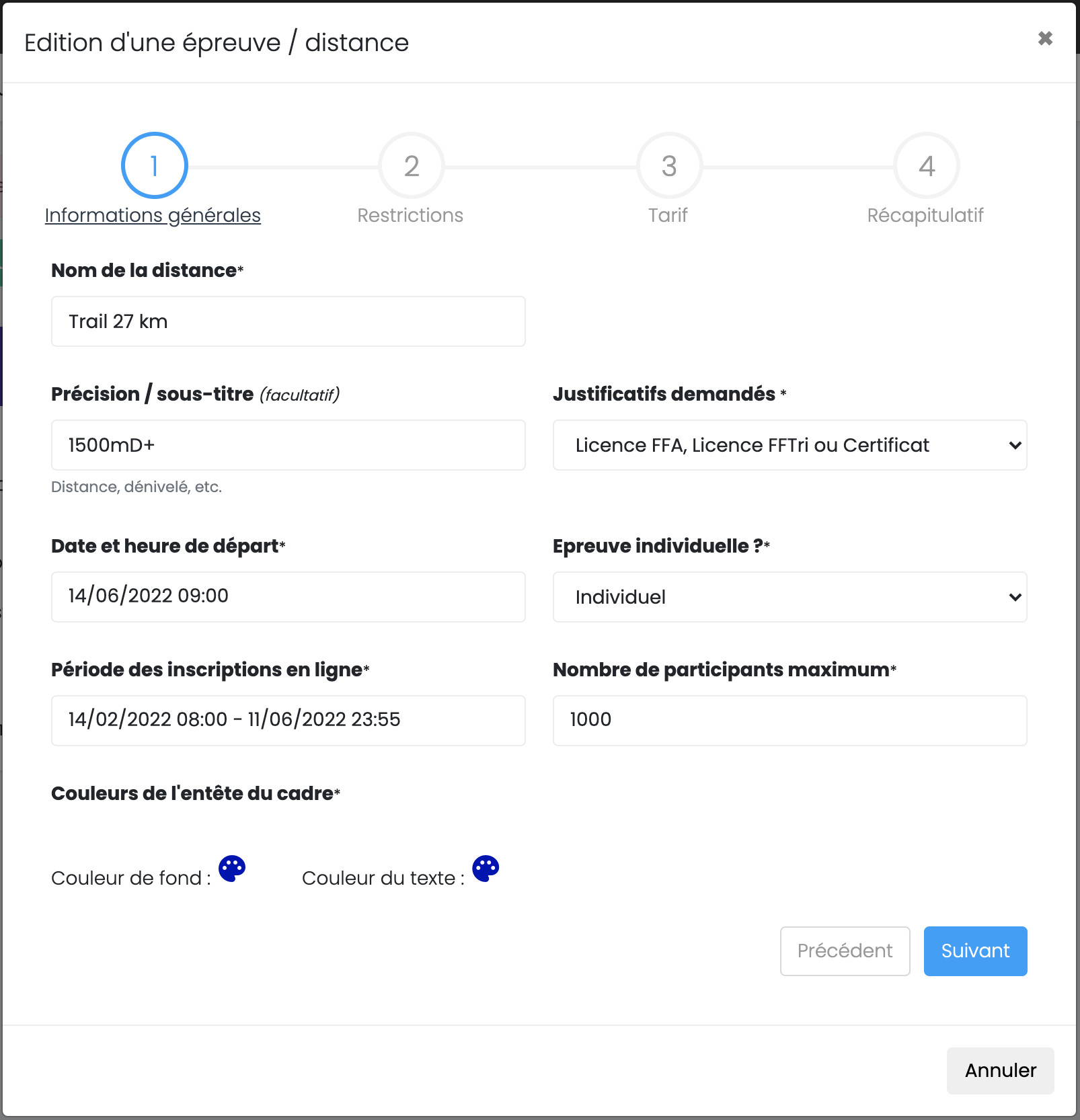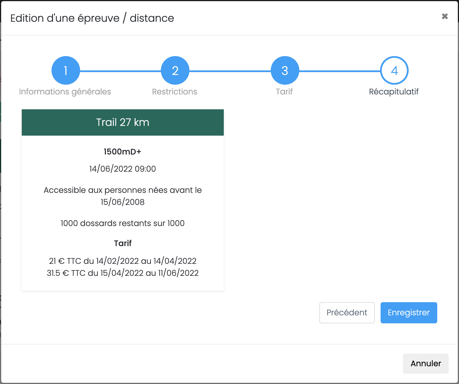 Ici vous créez et modifiez les différentes épreuves prévues lors de votre évènement afin que les internautes puissent s'y inscrire. C'est ici que vous allez définir les dates d'inscriptions et tarifs par exemple... Pour chaque distance créée sur cette page, un formulaire d'inscription sera automatiquement généré sur la partie visible par les futurs participants.