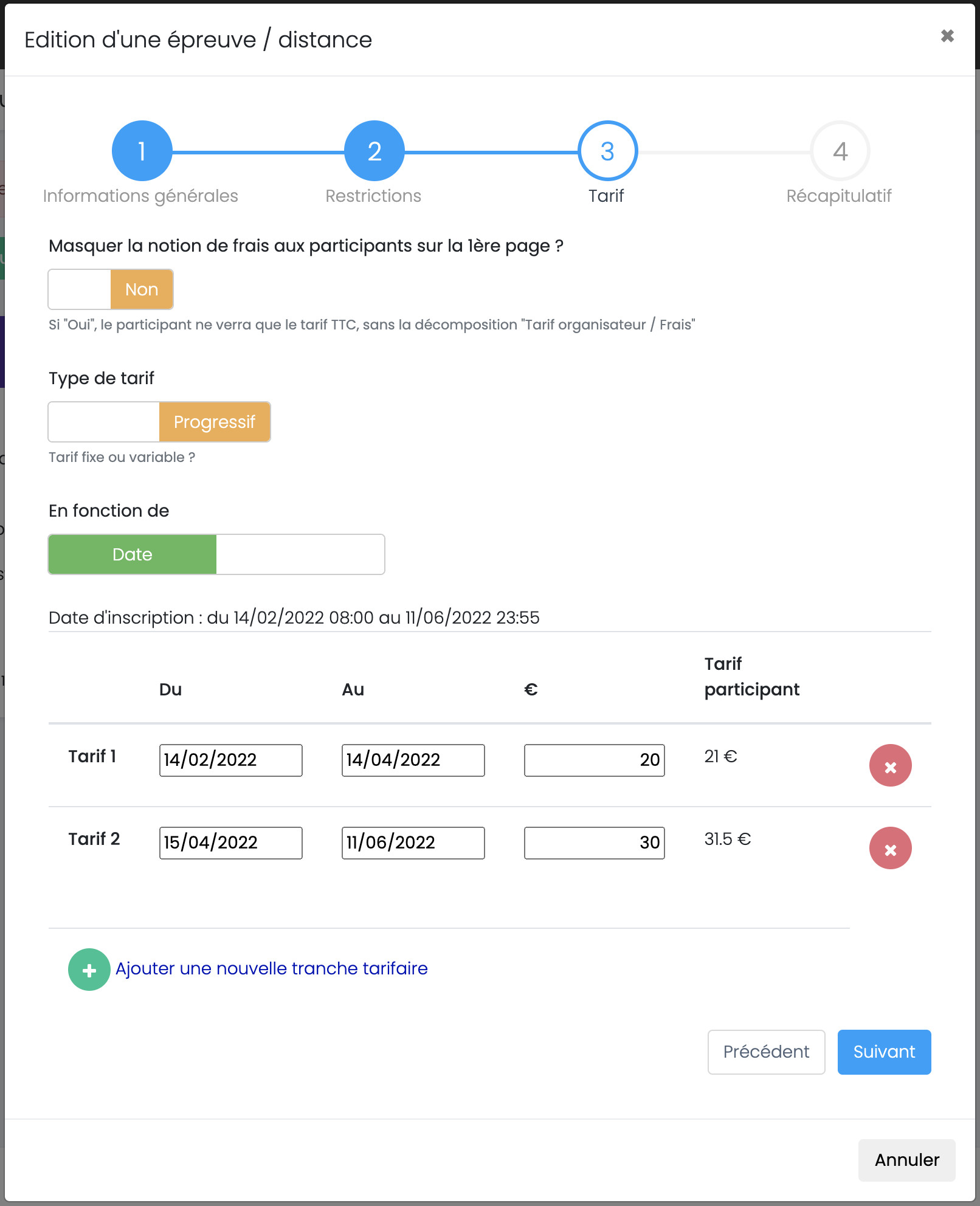 - Tarif augmentant en fonction du nombre de dossards déjà vendus