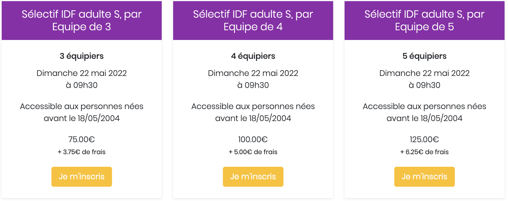 Sur une de vos épreuves, si vous laissez le choix aux participants de concourir par équipes de 3, 4 ou 5, nous vous proposons de créer plusieurs épreuves comme montré ci-dessous :