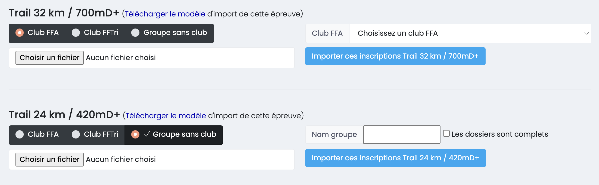 Au moment de l'import, vous indiquez si il s'agit d'un club FFA / FFTri ou d'un groupe de personnes (sans licences).