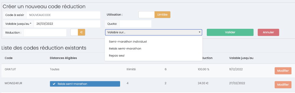 - La ou les épreuves sur lesquelles s'appliqueront exclusivement le code réduction en cours de création
